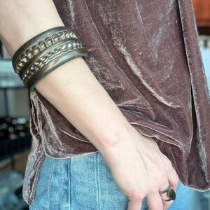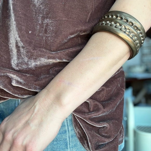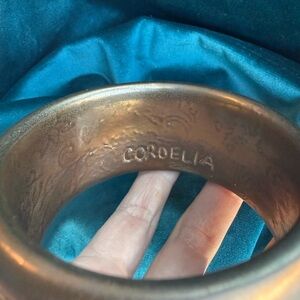 This one of a kind handmade ceramic cuff will be a standout piece in your collection, and is sure to pique the curiosity jewelry collectors wherever you go. With a scalloped band encircling the exterior, this piece hints toward Baroque sensibilities or lacy thoughts, while still bearing a masculine and modern sense. A secret delight for the wearer; enjoy the traditional hidden transfer decals subtly coming through the golden glaze on the interior. In the right light, her antique bronze vibe glaze glitters golden.