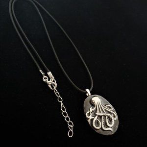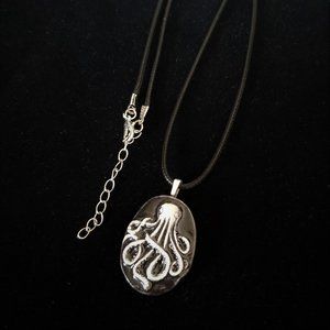 Handmade Ceramic Black Octopus Kraken Pendant Necklace. The Pendant is a handmade ceramic octopus/kraken pendant in a black glaze finish. It’s on a waxed cotton cord that measures 20” in length. It also comes with an extra 2” chain extender for length adjustment.