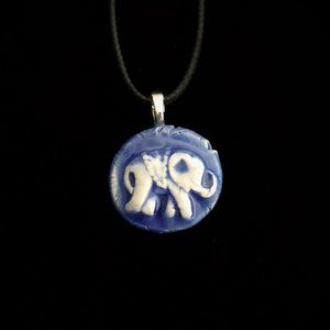 Handmade Ceramic Blue Elephant Pendant Necklace. The Pendant is a handmade ceramic elephant pendant in a blue glaze finish. It’s on a waxed cotton cord that measures 20” in length. It also comes with an extra 2” chain extender for length adjustment.