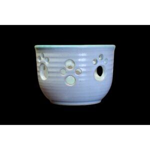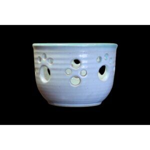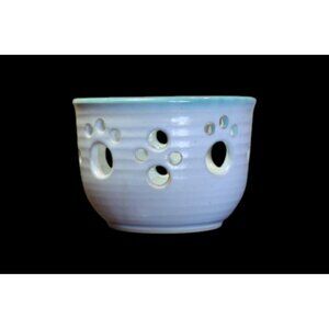 Add a touch of whimsy to your space with this vintage ceramic candle holder featuring a unique paw print cutout design. Crafted from smooth glazed pottery in a soft blue tone, this piece blends playful charm with minimalist style.
