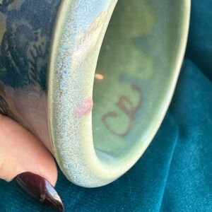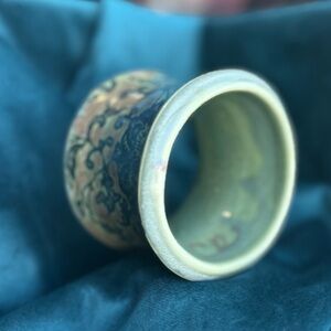 Unique Ceramic Cuff featuring traditional transfer decals and blushed hues of blue and green. The cuff is flanged out at each end for a comfort fit.
