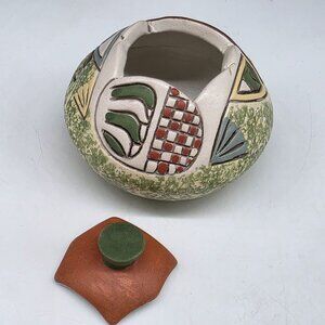 Handmade Ceramic Lidded Jar Abstract Multicolor Patterns & Textures Carved Desig