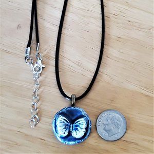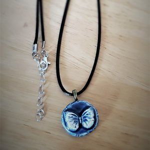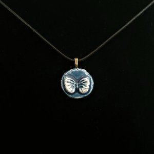 Handmade Ceramic Persian Blue Butterfly Pendant Necklace. The Pendant is a handmade ceramic butterfly pendant in a persian blue glaze finish. It’s on a waxed cotton cord that measures 20” in length. It also comes with an extra 2” chain extender for length adjustment