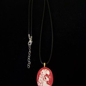 Handmade Ceramic Red Skull Cameo Pendant Necklace. The Pendant is a handmade ceramic skull cameo pendant in a red glaze finish. It’s on a waxed cotton cord that measures 20” in length. It also comes with an extra 2” chain extender for length adjustment.