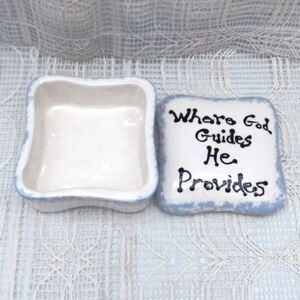 This treasure box is glazed white with blue trim around the edges. The sentence, "Where God Guides, He Provides is written in black handprinted lettering. It has a glossy finish.