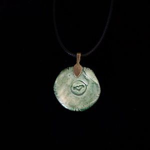 Handmade Ceramic Teak Green Sun Pendant Necklace. The Pendant is a handmade ceramic sun pendant in a teak green glaze finish. It’s on a waxed cotton cord that measures 20” in length. It also comes with an extra 2” chain extender for length adjustment.