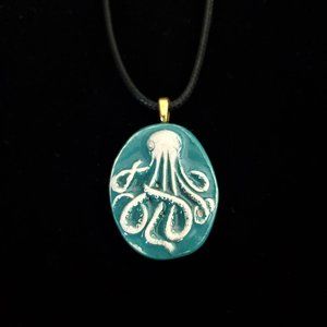 Handmade Ceramic Turquoise Octopus Kraken Pendant Necklace. The Pendant is a handmade ceramic octopus/kraken pendant in a turquoise glaze finish. It’s on a waxed cotton cord that measures 20” in length. It also comes with an extra 2” chain extender for length adjustment.