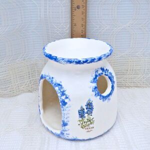 This tart warmer was slip cast and fired. The clear gloss glaze was applied and the scented wax warmer was fired a second time. 3 bluebonnet decals were applied and the piece was fired a third time, making it a beautiful addition to your bluebonnet decor. The vent hold on the sides of this wax burner are heart shaped. I have one in which the vent holes are circles. I'll be happy to show you that one if you're interested.