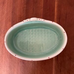7 1/2” wide by 4 3/4” deep by 3 1/4” high. Slight crazing, no chips or cracks. Has artists stamp, but I don’t remember their name.