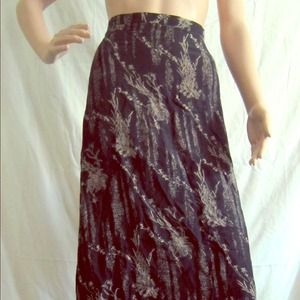 A handmade, one-of-a-kind maxi skirt made with 100% China Silk. Has a subtle bamboo print. Zipper in back and hook closure. A-line shape. Darts in front.