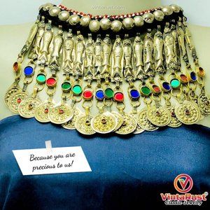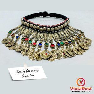 This tantalizing Afghani tribal choker necklace is a majestically handpicked tribal ornament from our collection. This vintage-inspired tribal choker is a collection of vibrant colors with dangling rhythmic tassels, tribal coins, and fish motifs. Every tassel of this tribal piece is embellished with glass stones of different colors and metallic coins.