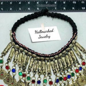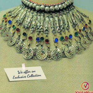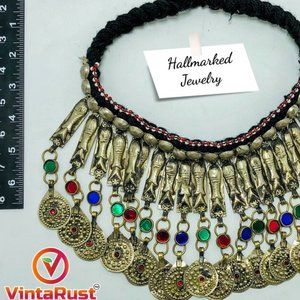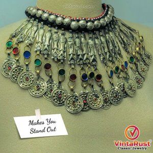 Made with fine quality materials and attractive glass stones, this vintage tribal costume jewelry piece carries a full tribal and traditional feel. This traditionally-rich choker necklace gives full traditional vibes whenever you wear it. A fine quality fabric is used with tribal beads to enhance the beauty of this tribal choker necklace.