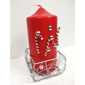 Handmade Christmas Candy Cane Pillar Candle with a Silver Basket Holder is in new, displayed only condition.
