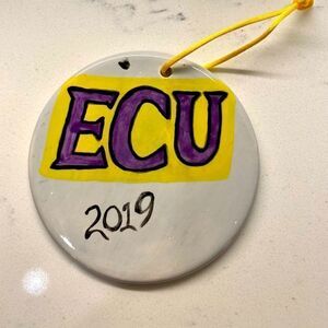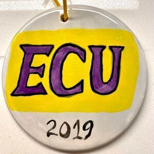 ECU Pirate Handmade 5" Ceramic Christmas Holiday Ornament. Made in 2019. Ceramic disc. Hand clean. Breakable. Handle with Care.