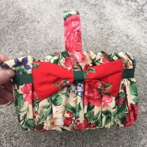Two red bows, one on front and one on back, green grosgrain ribbon around basket