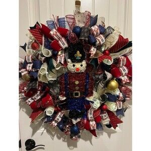 About 26 inches, 6 inch-deep door or mantle wreath. Blue, ivory and gold mesh back. December/ Christmas/ Nutcracker themed w/ vibrant colored wired ribbons (10styles). An adorable Tinsel Drummer Boy and ball ornaments adorn this festive wreath.