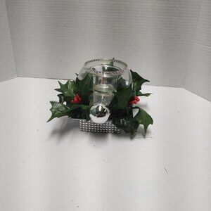 Handmade Christmas Holly & Silver Single Candle Holder Centerpiece - Brighten your holiday décor with this handmade single candle centerpiece, beautifully adorned with faux holly leaves, red berries, and silver ornament accents. The glass votive sits securely in a rhinestone-trimmed holder on a decorative base, making it a perfect accent for your dining table, mantel, or holiday display.