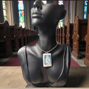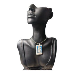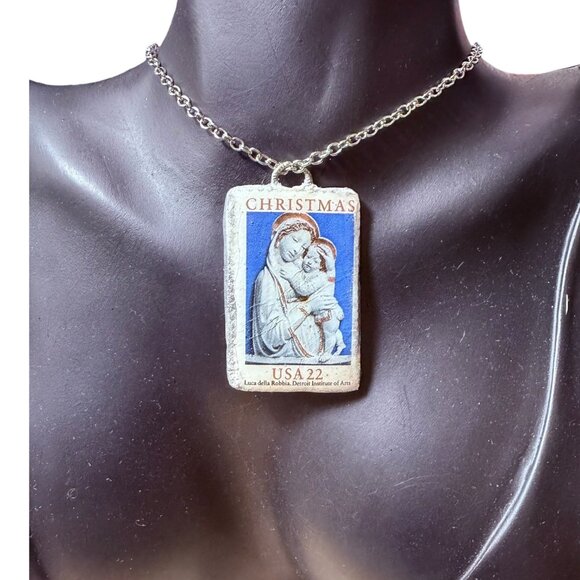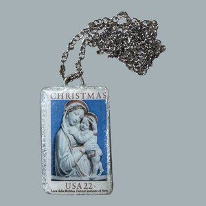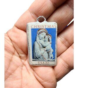This pendant is a labor of love, featuring a decoupaged and hand-painted rendition of the USA 22 Christmas stamp with Madonna & Child. Encased in resin and paired with a silver-toned chain, it’s a timeless blend of artistry and tradition, radiating warmth and meaning for the festive season.