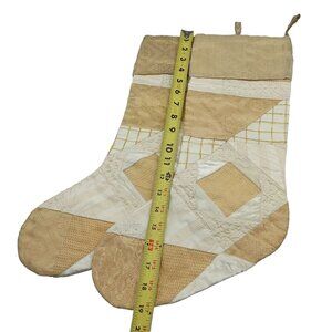 Two charming Christmas stockings made with intricate patchwork design, blending silk, pearl beads, cotton, and metallic. Delicate beige and cream hues evoke a timeless elegance. Each stocking is 19 inches long, offering ample space for holiday treasures. Professionally crafted in India, these stockings add a touch of sophistication to your holiday decor.