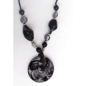 Pendant was created with clear and black glass and silver foil in a swirled pattern. Pendant is heavy and is 2 inches in diameter.