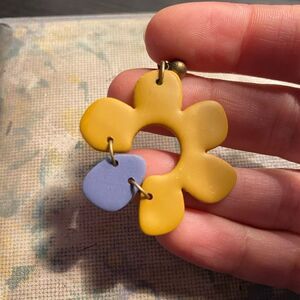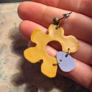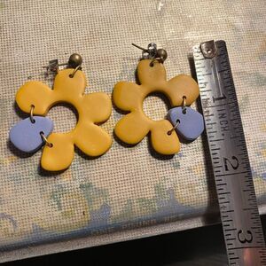 Keywords: Clay earrings, flower earrings, handmade jewelry, yellow and blue earrings, statement accessories, unique fashion.