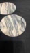 Set of four round coasters with a marble pattern. Features a blend of cream and gray colors.