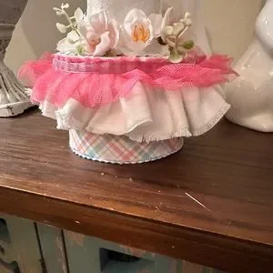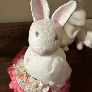 This glittery handmade clay rabbit is decked out for that special occasion! She sits atop of a weighted box covered in plaid paper,(not made to open) muslin, tulle, ribbons and light tones of cherry blossoms. Box and rabbit are a total of 9 inches tall. Shes a one of a kind!