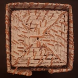Designed with a distressed look. Material feels like wicker. The coasters holder measures approximately 2.5" L x 4.5" W.