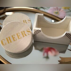 Handmade coasters made with love! These are wooden coasters with the word CHEERS on all six. With a gold and white color scheme it can match any decor and gives a simply touch. The holder is easy for storage and put away. These are water resistant!