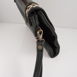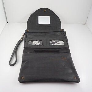 Entirely handmade and hand painted, this leather bag / wallet can be used as both a wristlet or worn as a crossbody. It features a Pied or Brozefallow Cockatiel on one side and measures 8.25 inches long, about 1 inch wide, and 6.25 inches high when closed and 18 inches when open. Comes with both the 3/8 inch wide wristlet strap and adjustable .5 inch crossbody strap. The front features a snap closure and the inside reveals a 2.5 x 2 inch mirror (visible area) followed by a zippered pocket, card pockets with windows on the bottom two, a pen/pencil holder, and another zippered and open pocket. It is black, new, and in good condition with Parrot Addict, Cockatiel stamped within. Be sure to check out my closet for more Birdie bags.