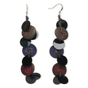 Exotic-looking earrings feature disks made from painted coconut palm tree wood and nylon