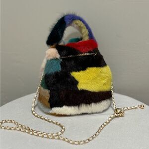 One of a kind! Brand new. This gorgeous bucket bag is handmade from dyed genuine Mink fur block stitched (patchwork). Both sides are uniquely beautiful, lightweight.