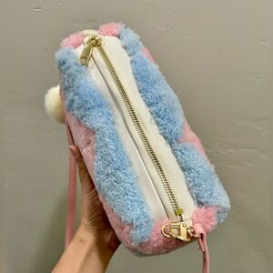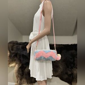Brand new. One of a kind. This Stylish barrel bag is handmade from dyed genuine shearling leather patchwork, Includes double Rabbit fur balls bag charm. Spacious enough for your phone, wallet, cosmetics, sunglasses, compact umbrella, credit cards, keys & other items. Includes 2 straps and 1 chain, can be used as a wristlet, shoulder bag or cross body bag.