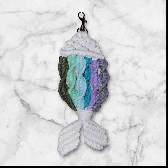 Upgrade your keys with this vibrant handmade by me, fish-shaped keychain. Featuring a blend of white, green, blue, and purple colors, it's perfect for adding a splash of color to your keys.