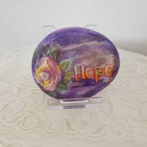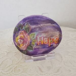 This is my Inspirational rock that was painted to be a reminder that there's always hope. Colorful, multi-colored purple and orange Rose and the word Hope. Can be used indoor or outdoor.