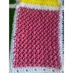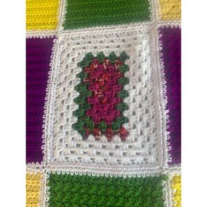 This exquisite crocheted blanket, adorned with a mosaic of vibrant colors, evokes a sense of warmth and comfort. Each stitch tells a story, weaving together threads of pink, green, yellow, and purple to create a harmonious and inviting piece.