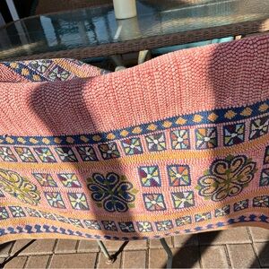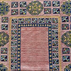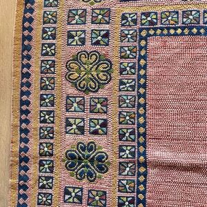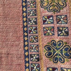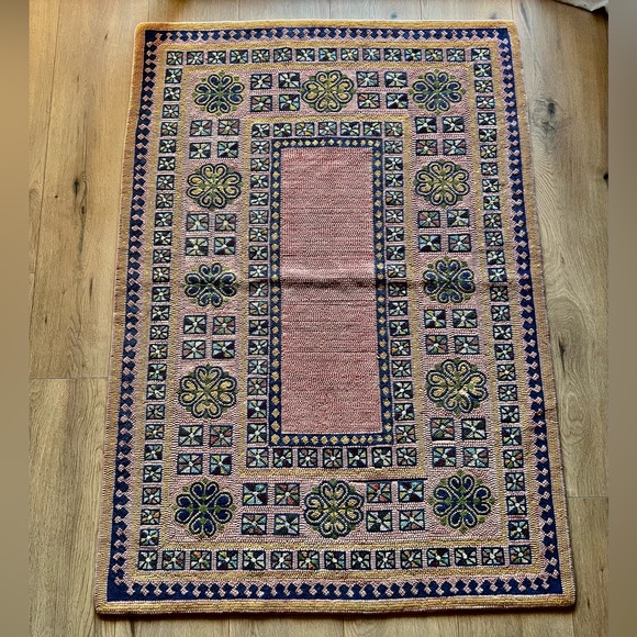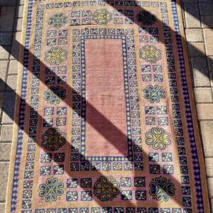 Handmade area rug with intricate patterns. Features shades of blue, pink, and yellow.