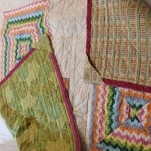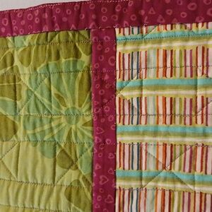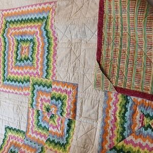 Beautiful handmade quilt in perfect condition. This is a reversible quilt that is white with multicolored squares on one side, and green floral print and multicolored stripes on the other. Signed by the artist, very neat piece. Measures 60 x 56 inches. Cotton fabric in a nice medium weight. Check out my other listings to bundle and save!:)