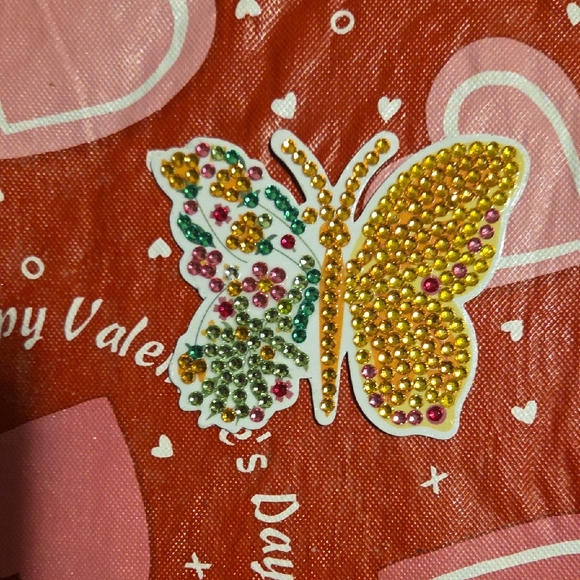 Vibrant butterfly magnet adorned with rhinestones. Features gold, pink, and green accents.