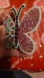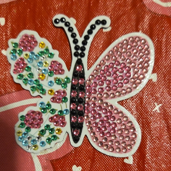 Sparkling butterfly magnet with rhinestones. Features pink, black, green, and blue accents. Perfect for adding flair to any room.