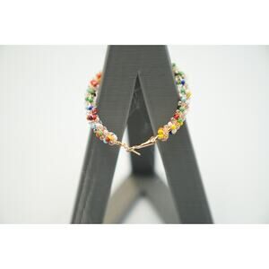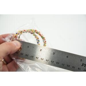 These vibrant handmade hoop earrings feature multicolor seed beads delicately wrapped around a lightweight wire hoop. Measuring approximately 2.5 inches in diameter, they offer a bold bohemian look without the weight. Perfect for festivals, beach days, or casual outfits needing a fun pop of color. Excellent condition with no missing beads or visible wear. Great for gifting or daily accessorizing.