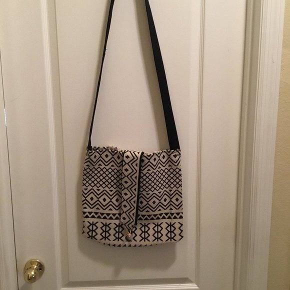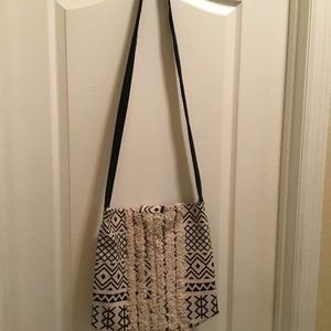 Black and White Woven Crossbody Bag with fabric designs, inner pockets, has crystal ball for closure. has matching Mask. Great to carry Laptop, Camera's, cell phones etc.