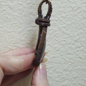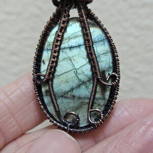 The stone is a Labradorite Cabochon. Labradorite's are known for their color flashes. I've tilted the stone different angles so you can see the colors. This stone has a lot of green flashes. The wire used is pure Copper, not coated, and has been oxidized. A small polishing cloth will be included.