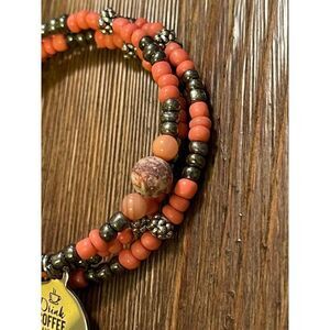 Coral and gray beaded bracelet made from memory wire with a laser engraved charm that says Drink coffee and be awesome
