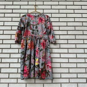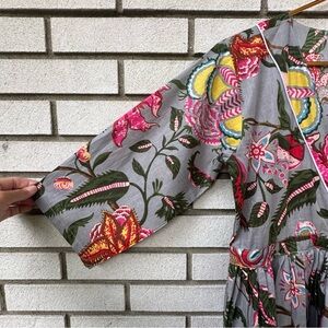 Beautiful handmade cotton dress from TapestryHubIndia, size Small. Purchased by my mother-in-law for herself but never worn. Features a bold and vibrant Indian block print with florals in pink, red, yellow, and green on a soft gray base. Designed with a deep V-neck, flattering empire waist with adjustable tassel tie, and 3/4 wide sleeves. Skirt is softly pleated for movement and ease. Pulls on over the head, no closure. Crafted from lightweight cotton—perfect for layering in cooler months or wearing solo in warmer weather. Pockets at the sides for added comfort and functionality.