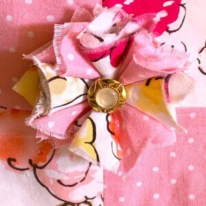 This is a handmade one-of-a-kind shoulder bag or crossbody bag. Made of 100% cotton fabric and constructed with interfacing for structure and stability. Includes adjustable strap, magnetic snap closure, lining with pockets, silver tone hardware and a handmade shabby chic flower accent. The front of the bag features an outside zippered pocket with the handmade flower accent, and the back has 2 nice slip pockets. It has a beige cotton lining with 2 interior slip pockets as well. The front of the bag is made of coordinating pink floral and polka dot fabric squares with the back slip pocket done in pink polka dot on a beige back panel. It measures about 8 inches tall, 7 inches wide and 1.5 inch deep. The adjustable strap can be worn as a shoulder bag or lengthened into a crossbody bag. This is a very cute bag, handmade with care and attention to detail. Versatile and durable, yet so pretty and fun. You will get compliments whenever you carry this super sweet handbag.