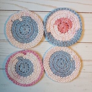 4 handmade washable cotton facial rounds. Can also be used in auto cup holders. Crocheted by myself with 100 percent cotton yarn.