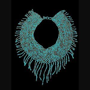 Handmade Crafted Beaded Turquoise Black Bead 17"L Fringe Collar Necklace