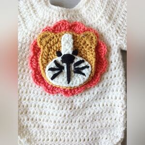 Adorable handmade cream baby onesie featuring a cute lion design in orange and black.