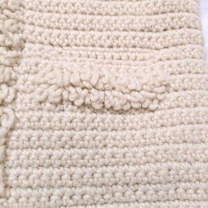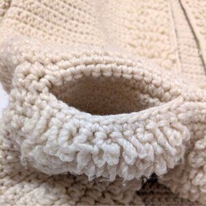 Crafted from soft wool, this handmade cream crochet jacket offers both style and warmth. Features include a sturdy zipper closure, dual front pockets, and a textured finish. Slight stain on the back right side noted in photos. Durable and versatile for cooler seasons.